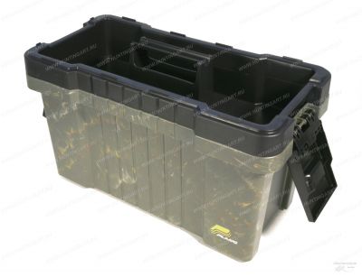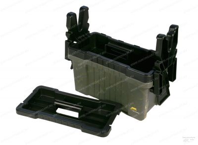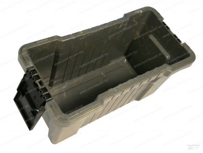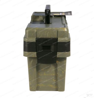 Переноска ящика осуществляется за счет небольшой удобной ручки, которая покрыта антискользящим покрытием, что является огромным преимуществом при транспортировке загруженного ящика, особенно в сырую погоду. Закрывается ящик на два надежных боковых замка-защелки.