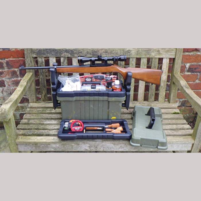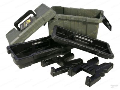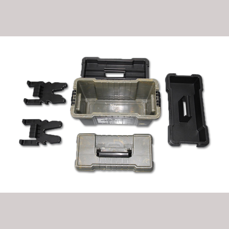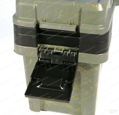 Предназначен для транспортировки, хранения аксессуаров и принадлежностей к оружию, а также для чистки оружия. Изготовлен ящик из прочного пластика камуфляжной расцветки. В комплекте есть две специальные подставки для оружия и два вместительных вынимаемых лотка (поддона) разной высоты, для любых принадлежностей (мелких предметов и чистящих средств).