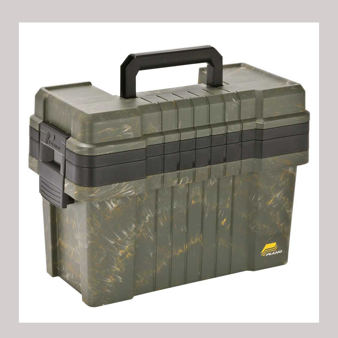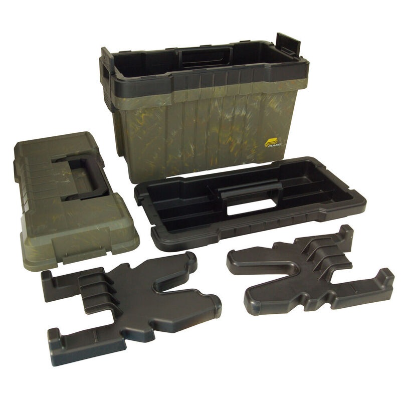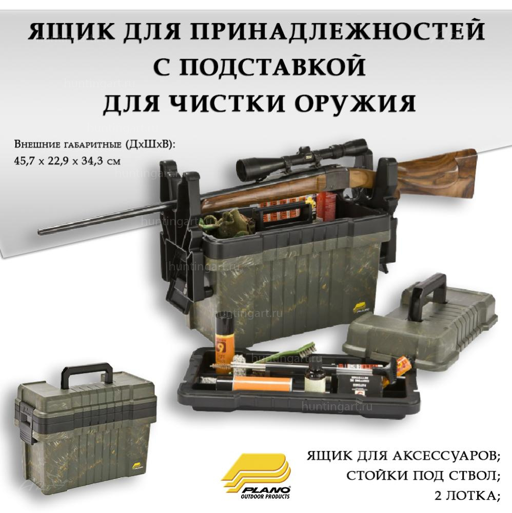 Подставка для чистки оружия-ящик для хранения от Американской компании Plano(Плано).Внешние габариты 45,7х22,9х34,3см. Просторный ящик,предназначен для удобства хранения охотничьих принадлежностей и аксессуаров. Для чистки оружия есть специальные съемные подставки и два съемных вместительных лотка.Ящик зелёного-камуфляжного цвета очень прочный,оснащён надёжными замками и удобной ручкой.