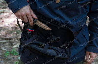 На передней панели расположен небольшой кармашек на молнии и липучка для неймтэйпа. Основное отделение закрывается на молнию с двумя замками. Замки снабжены ухватками из паракорда. Молния доходит до двух третей высоты подсумка, обеспечивая удобный доступ внутрь отделения, при этом ничего из сумки не выпадает. На передней стенке сумки, есть сетчатый карман закрывающийся на кнопку. Также имеется пластиковый карабин для подвески ключей или других предметов. Стенка подсумка, прилегающая к телу выполнена из неопрена. На ней нашито 2 резинки 6х2,5 см., для газового баллона, фонаря и т.д. В неопрене есть два выреза 6,5 см под углом 45 градусов, для скрытого ношения короткоствольного оружия. Вырезы в неопрене и образуют кобуру. Так же в вырезы удобно входит нож в ножнах.