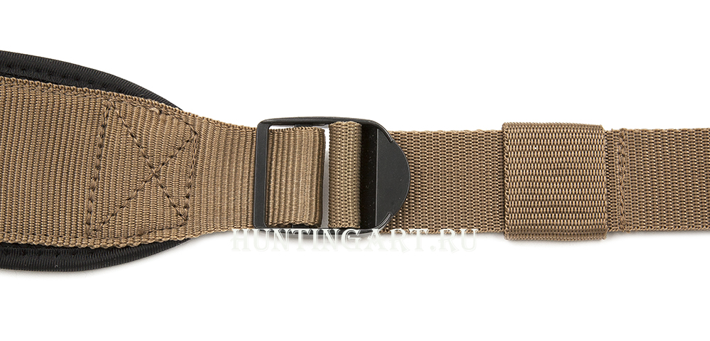 Светло-коричневый ремень изготовлен из капрона, на плечевой части предусмотрена мягкая прокладка из неопрена черного цвета, которая распределяет нагрузку и предотвращает потертости. Ширина этой части — 6 см. Длину можно регулировать в диапазоне от 55 до 115 см.