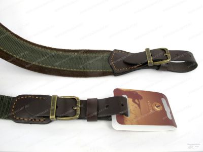 Материал ружейного ремня - полиамидная лента и натуральная кожа. Подкладка выполнена из велюра. На плечевой части имеется петля из натуральной кожи для большого пальца руки, служащая для удержания оружия на плече при ходьбе. Длина ремня для ружья регулируется. Рабочая сторона ремня для оружия обладает нескользящими свойствами. Детали, крепящиеся к пряжкам, изготовлены из натуральной кожи (цвет коричневый). Ширина ремешков крепления на антабку оружия 21 мм. Укреплены заклепками. Изделие прошито прочными лавсановыми нитями.