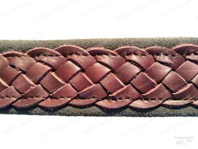Ремень выполнен из натуральной кожи. С лицевой стороны кожа гладкая, коричневого цвета. Рисунок плетенка (косичка) нашит на замшевую основу. С внутренней стороны кожа обработана под замшу (цвет темно-серый/черный). Ширина основы 4 см, ширина декоративной нашивки 3 см (по краям получается черный кант шириной 0,5 см с каждой стороны. На концах ремня расположены петли для карабина. Одна петля стандартная с винтовым зажимом, вторая петля с регулировкой длины, снабжена винтовым зажимом (винт + основание с внутренней резьбой). Шаг длины (изменение длины) регулируется пробитыми отверстиями. Ширина петель 3 см.
