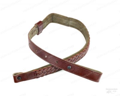 Надёжный ремень для карабина из плетённой кожи коричневого цвета. С каждой стороны - петли для карабина. Для комфортной эксплуатации - изнутри мягкая замша.