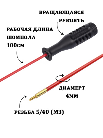 Односекционный шомпол диаметром 4мм применяется для чистки канала ствола после стрельбы. Также это приспособление поможет смазать внутреннюю поверхность ствола после чистки и удалить ржавчину или налет освинцовки, которые часто появляется на металлических поверхностях. Выполнен из цельного куска стали, сверху покрыт оплеткой ПВХ красного цвета.