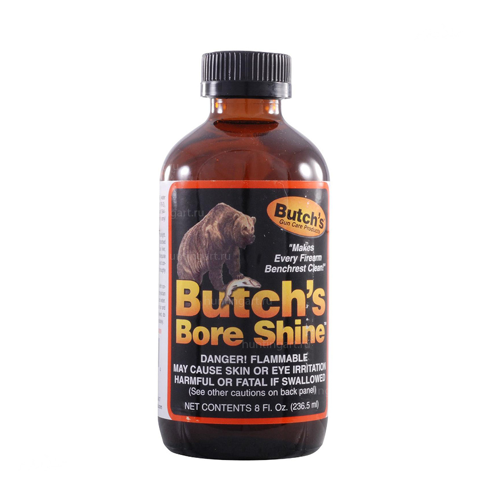 Butch’s Bore Shine - относится к "традиционному" типу растворов. Содержит аммиак для растворения меди, химические чистящие соединения для удаления нагара (карбоновых отложений) и смазочные защитные элементы для консервации и ухода за стволом после чистки. Составы Butch’s , пожалкуй, самые используемые, на сегодняшний день, средства среди бенчрест сообщества, и это не спроста - Butch's работает быстро и эффективно.