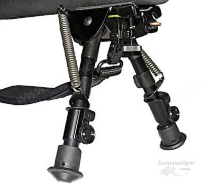 База сошек – цельная, прочная. Крепятся сошки под цевьё за антабочный винт или за ствол оружия (специальный адаптор в комплект не входит, а приобретается отдельно). Идеально подходят для стрельбы сидя или лёжа. Ножки со встроенными возвратными пружинами быстро и легко складываются. Длина ножек плавно регулируется от 300 мм. до 640 мм. Каждая ножка состоит из 3-х секций (одна - основная и две - дополнительные). Длину можно регулировать на любую высоту, с высокой точностью. Выдвинуть вторую секцию на нужную длину и зафиксировать стопорным кольцом, а третья секция фиксируется при полном её выдвижении до упора. При необходимости сложить вторую секцию нужно ослабить стопорный винт и секция автоматически сложится. Чтобы сложить третью секцию нужно нажать на кнопку стопорного кольца – секция автоматически складывается. Ножки сошек складываются вдоль цевья или ствола в одном направлении.