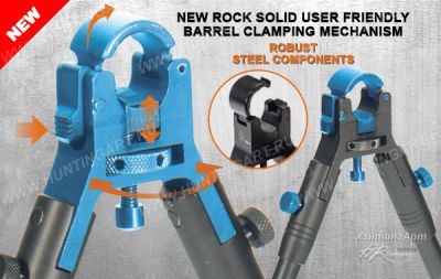 Походные сошки для установки на ствол оружия диаметром от 10 мм до 19 мм. Сошки изготовлены из прочного алюминиевого сплава. Быстро отсоединяются и компактно складываются для транспортировки. Ножки сошек имеют скругленную форму на концах, рифленых для более устойчивого сцепления с поверхностью и обрезиненные. Сошки - регулируемые по высоте