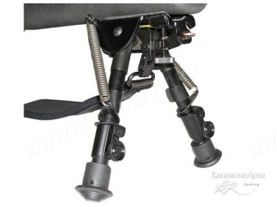 База сошек – цельная, прочная. Крепятся сошки под цевьё за антабочный винт или за ствол оружия (специальный адаптор в комплект не входит, а приобретается отдельно). Идеально подходят для стрельбы сидя или лёжа. Ножки со встроенными возвратными пружинами быстро и легко складываются. Длина ножек плавно регулируется от 230мм. до 330мм. Каждая ножка состоит из 2-х секций. Длину можно регулировать на любую высоту, с высокой точностью. Выдвинуть на нужную длину, зафиксировать стопорным кольцом. При необходимости сложить сошки нужно ослабить стопорное кольцо и они автоматически сложатся. При выдвижении ножки до конца, она автоматически стопориться. А при нажатии на кнопку стопорного кольца – автоматически складывается. Ножки сошек складываются вдоль цевья или ствола в одном направлении.