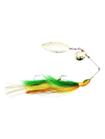 BIONIC BUCKTAIL® SPINNERBAIT - жабо из меха с хвоста белохвостого оленя, окрашенного в разные цвета, петушиного пера и люрекса. Бактейл — подвижный материал, сохраняет форму и объём во время быстрой проводки. Перо с седла петуха даёт дополнительное, волнообразное движение. Люрекс даёт мерцающий блеск. Дизайн головы в форме «корпуса лодки» (deep-V) для прямой проводки и удаления растительности Приманки оснащена двумя крюками VMC 7/0. Один жёстко соединён с головой приманки, второй свободно подвешен на цевье первого и закреплён от соскакивания. Такая конструкция способна "зацепить" даже самую осторожную рыбу, которая только "щиплет" приманку за хвост.