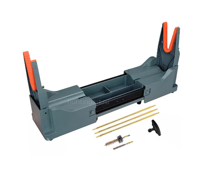 Станок раздвижной для чистки и уходом за оружием. В сложенном виде его размер составляет 36x13,5x26,4 см, раздвигается до 57,4 см. В комплекте поставляется разборный трех секционный шомпол .22 калибра и два ершика. Подходит для большинства типов оружия.