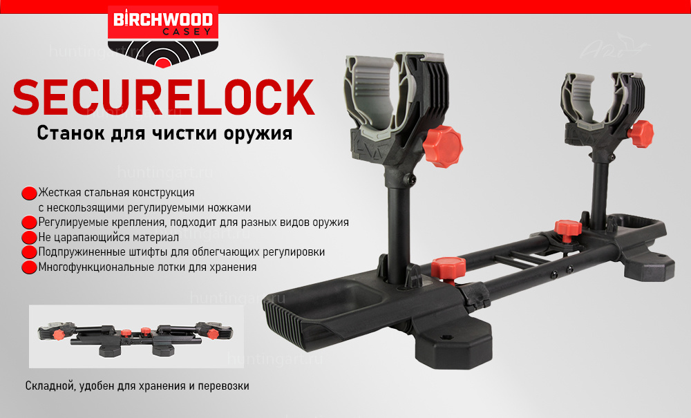Станок для чистки огнестрельного оружия от Birchwood Casey оснащен тисками SecureLock Gun Vise для надежной фиксации оружия под любым углом, а также имеет регулировку высоты для разных типов оружия, а встроенные лотки обеспечивают удобное хранение принадлежностей. Станок складывается и не занимает много места.