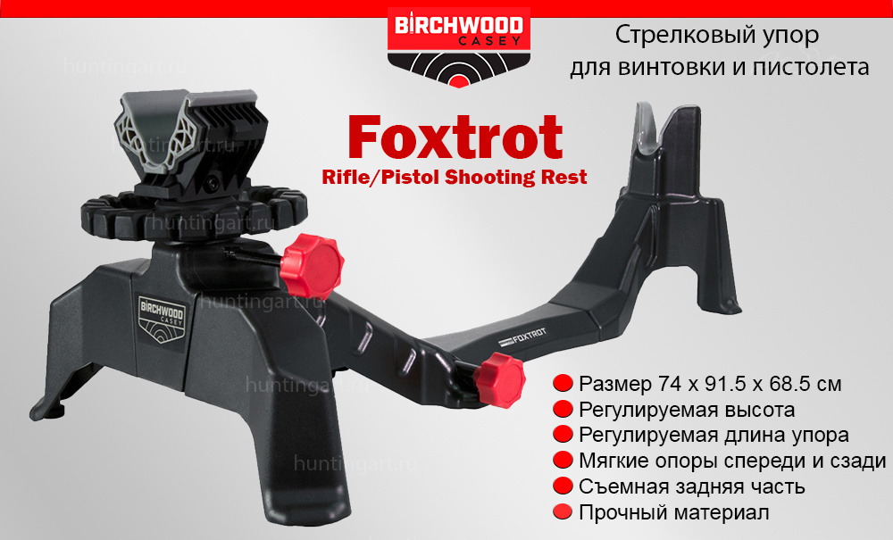 Стрелковый упор “Foxtrot Rifle/Pistol Shooting Rest” совместим с большинством видов оружия. Установка упора для стрельбы из винтовки или пистолета не требует использования инструментов. Достаточно отвинтить задний упор с мягкой опорой и центральную часть. Быстросъёмная конструкция позволяет регулировать высоту упора и обеспечивает его универсальность. Упор изготовлен из высокопрочных полимеров, что делает его лёгким и прочным. Упор легко разбирается для удобной транспортировки. Отвинтив или закрутив центральный элемент, можно регулировать длину упора под выбранное оружие. Вес упора составляет 1,36 кг (3 фунта)