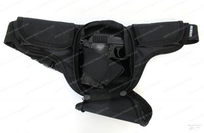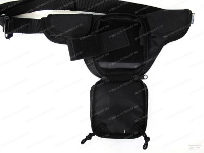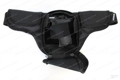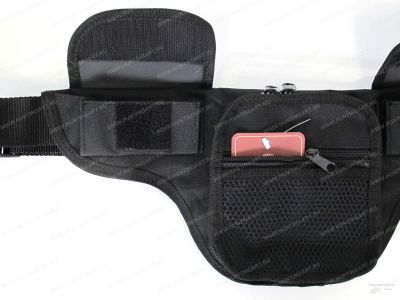 В основном Т-образном отделении располагается липучка-velcro, к которой прикреплена съемная резинка, выполняющая роль обхвата пистолета (подходит для большинства моделей: ПМ, ТТ, Наган, ОСА, ИЖ-71 и схожих по размерам). В передней части находятся 1 отделение на молнии. Поверх него расположен карман-сеточка для мелких предметов. По бокам имеются 2 небольших кармашка под магазины или патроны габаритами 9х5см. Переноска осуществляется при помощи поясного ремня. Ремень регулируется по длине и крепится при помощи защелки-фастекс. Изделие непромокаемое и не боится дождя.