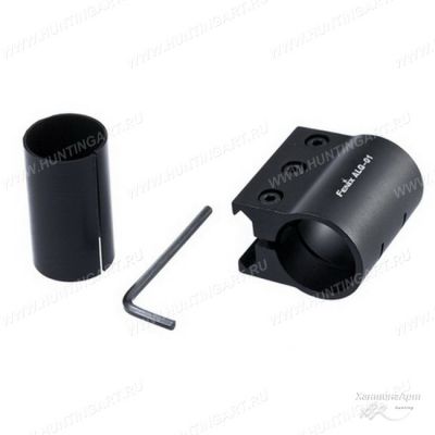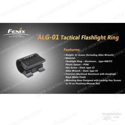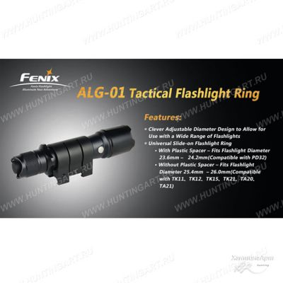 Подходит для крепления тактического фонаря Fenix на планку Пикатинни ALG01. В комплекте имеется специальная втулка для возможности установить фонари разных диаметров. С втулкой в кронштейне устанавливаются фонари с диаметром 23,6 - 24,2 мм, а без нее крепление совместимо с моделями размером 25,4 - 26 мм в диаметре. Крепление весит всего 51 грамм.