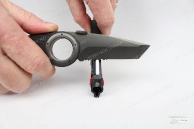 Точильная поверхность устанавливается на специальную платформу, которая крепится непосредственно к основанию. Благодаря подвижным металлическим стержням, основание устойчиво держится на любой ровной поверхности даже без дополнительных присосок. Платформу с точильными камнями можно установить в двух положениях в зависимости от того, какой нож вам необходимо заточить. Съемные направляющие угла предполагают заточку для кухонных ножей под углом 17° и прочих, в том числе и туристических, под углом 20°. Алмазных камня в наборе — два. Для более грубой заточки используется камень с зернистостью 320 грит, а для возобновления остроты того, который лишь немного затупился — 600 грит. Оба камня легко устанавливаются на платформе. Сама платформа — подвижная. Эта особенность позволяет выдержать установленный угол заточки на протяжении всей длины лезвия.