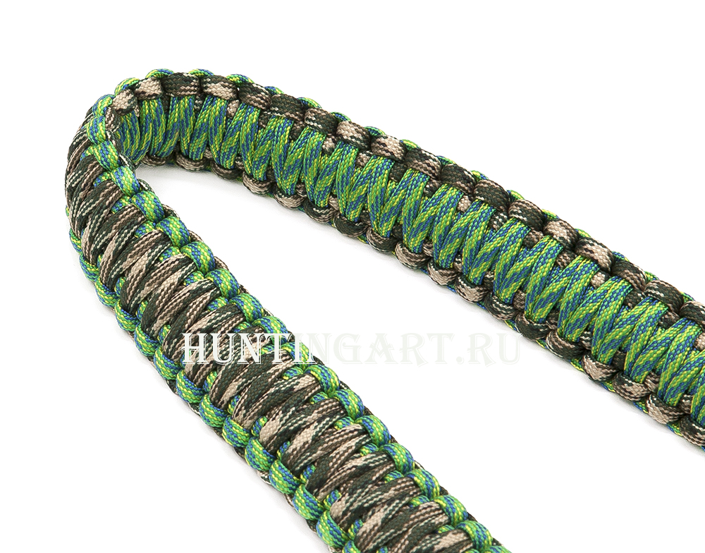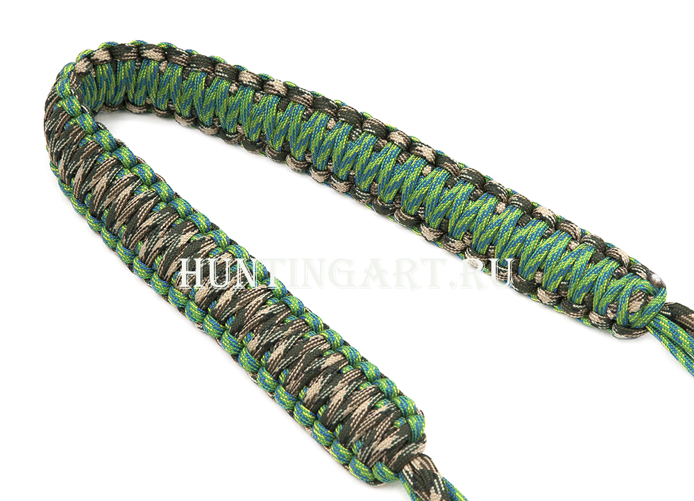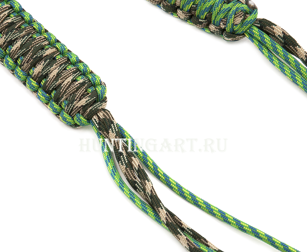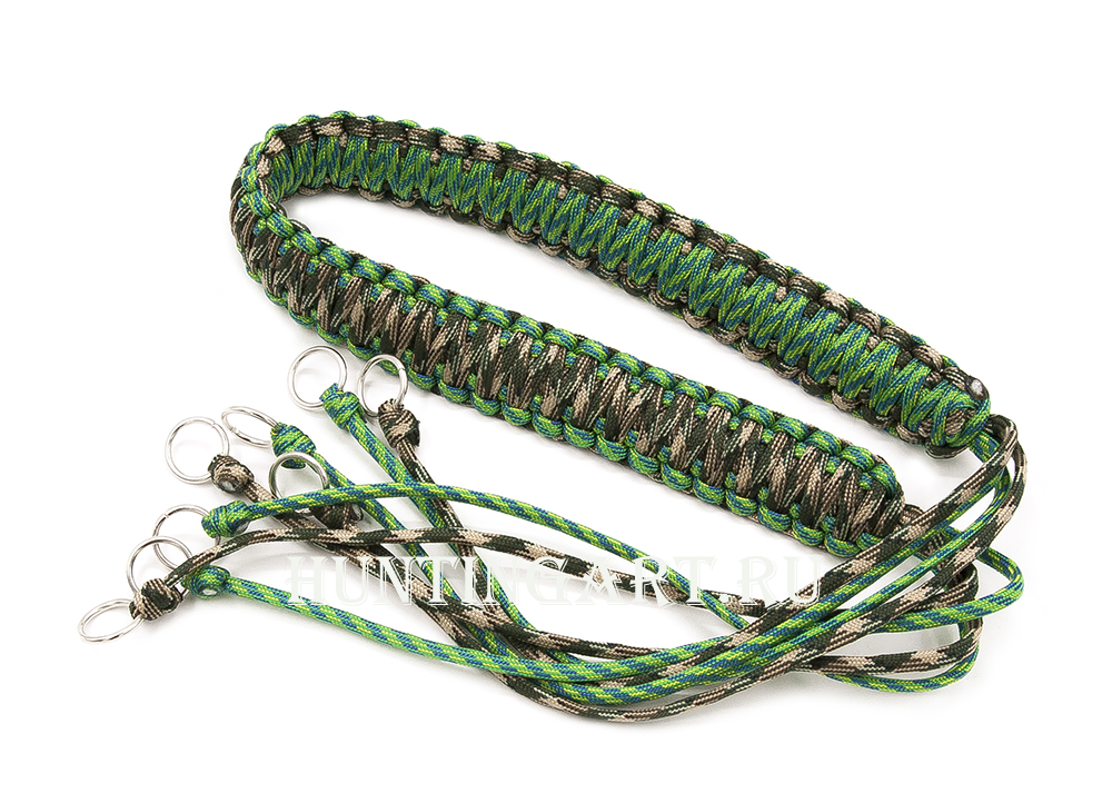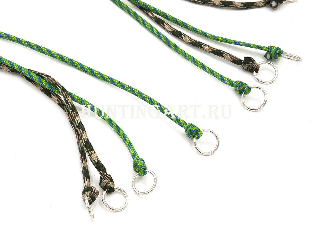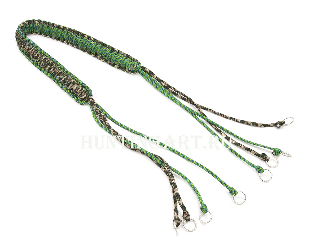 Подвес выполнен из паракорда (нейлоновый трос с сердечником) высокого качества. Состоит из 8 подвесок с кольцами для подвешивания битой дичи. Широкий плетеный ремень позволяет перенести дичь на плече или на шее, достаточно высоко от воды и земли, не испачкать добытую дичь и не держать её погруженной воду при выходе с разливов на сухое место.