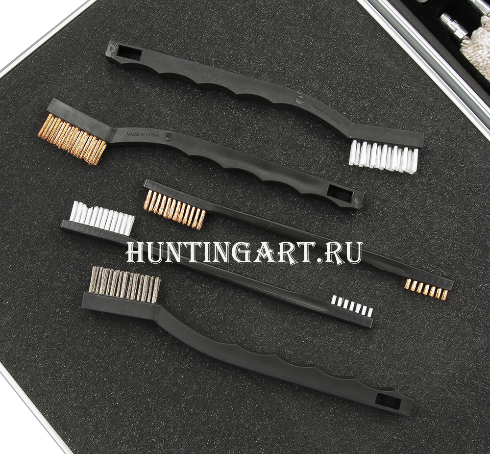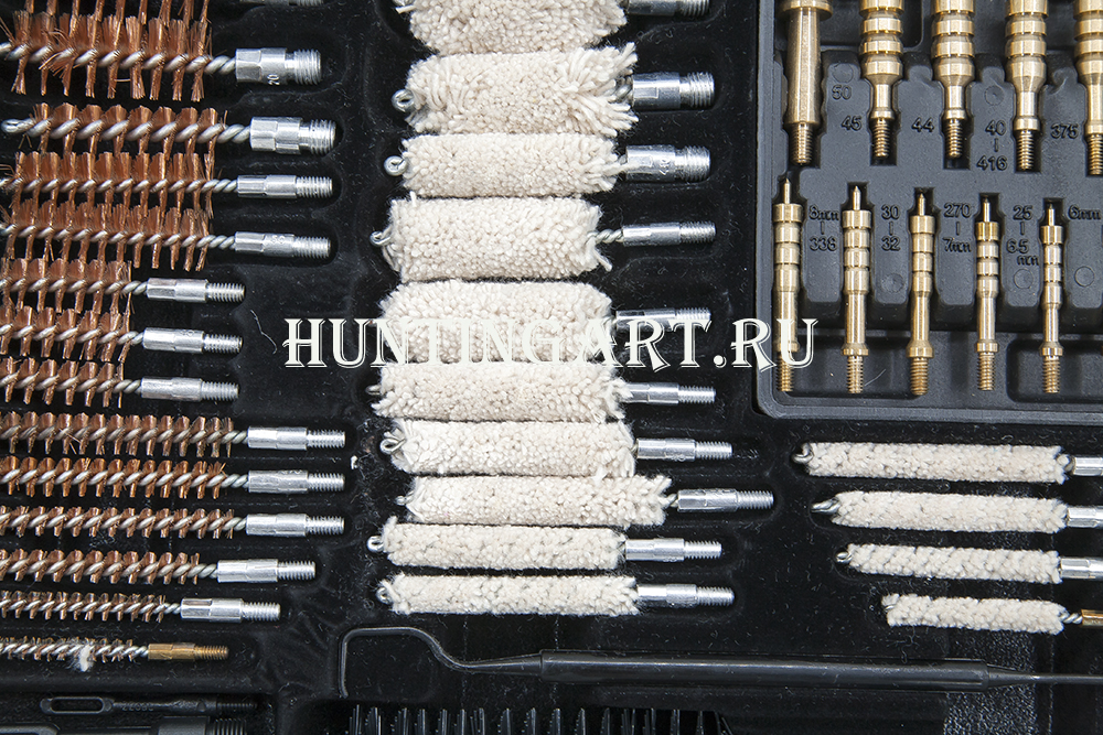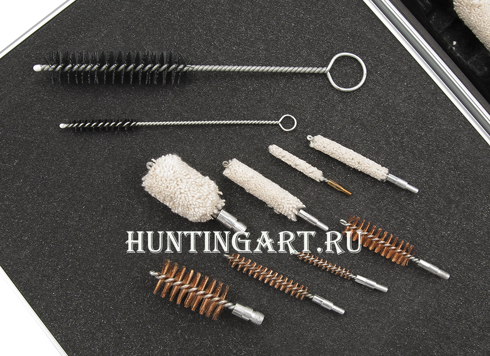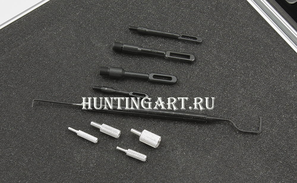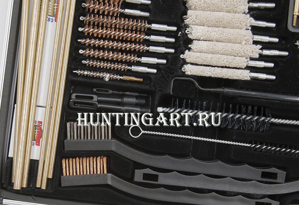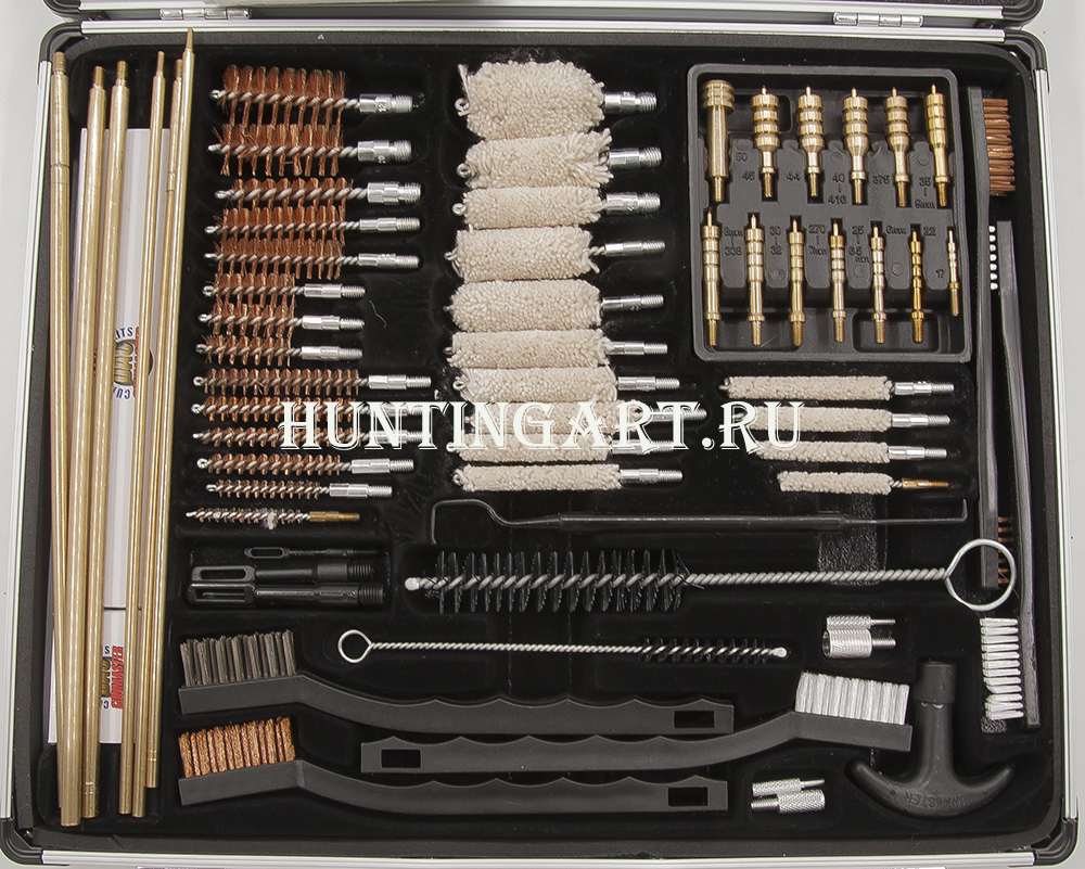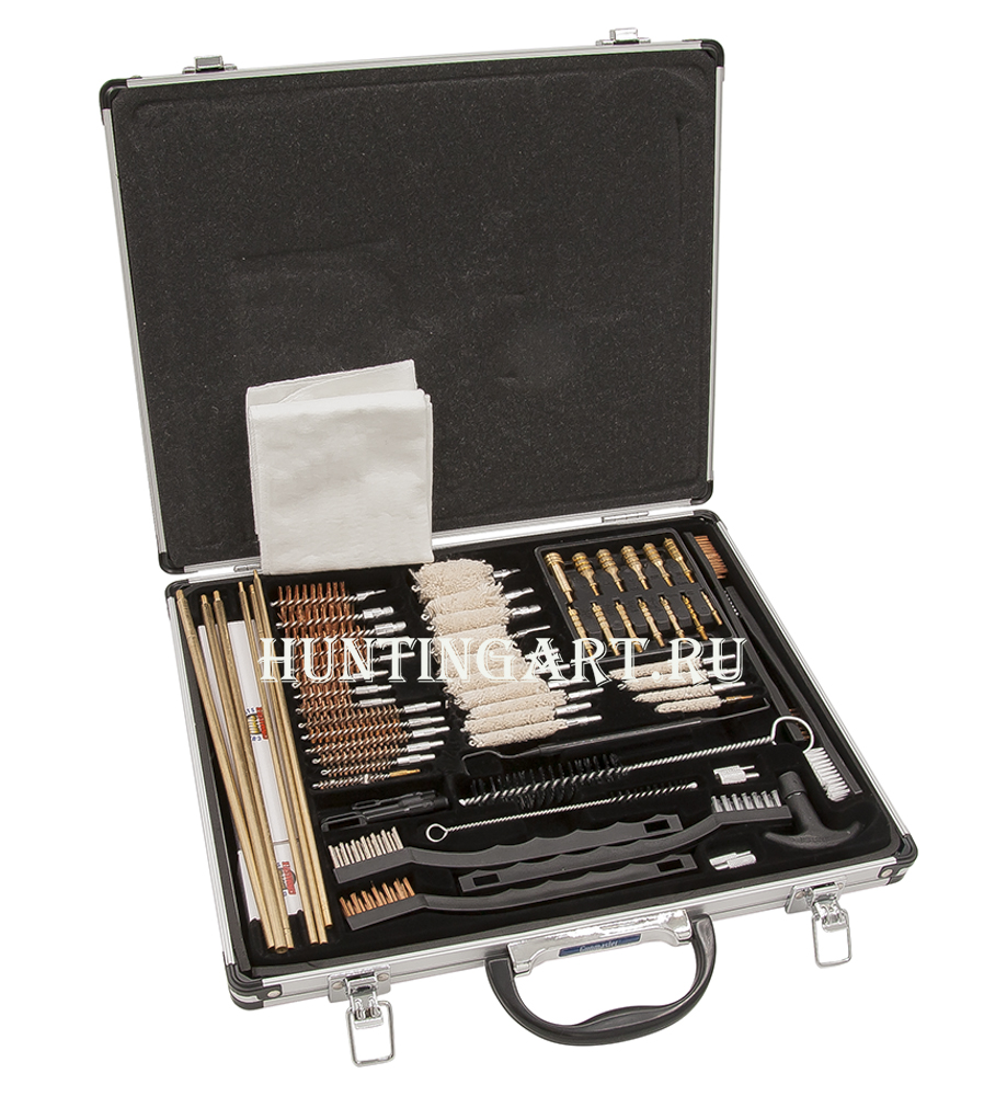 Набор имеет большое количество приборов и аксессуаров для качественной чистки и надежного хранения оружия разнообразных калибров. Предназначен для чистки пистолетов, винтовок и дробовиков. Набор поставляется в небольшом и элегантном алюминиевом кейсе.