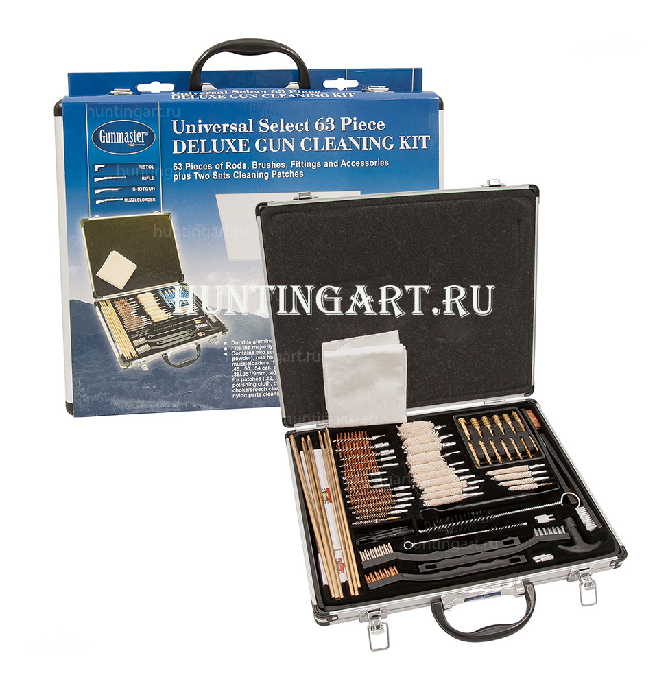 Прекрасный универсальный набор для чистки различных калибров оружия от 17 калибра пневматики 4.5 мм до 12 калибра гладкого оружия. Вам больше не потребуется тратить время и докупать различные расходники, в наборе есть все самое необходимое для всех калибров (щетки, ершики, пуховки, переходники, патчи, иголки, шомпола). Набор поставляется в небольшом и элегантном алюминиевом кейсе. Всего 63 предмета.