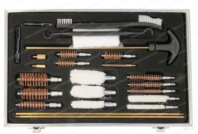 Многофункциональный набор поставляется в небольшом и элегантном кейсе с замками. Кейс изготовлен из прочного алюминия. Подходит практически для всех калибров ружей, карабинов и пистолетов.