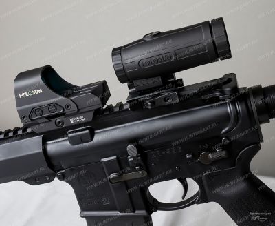 Увеличитель для коллиматора Holosun откидной, быстросъемный, кратность х3 с высотой оси co-witnes (37мм) + проставка до высоты оси 1/3 co-witnes (41,6мм) произведен Американской компанией Holosun Technologies.