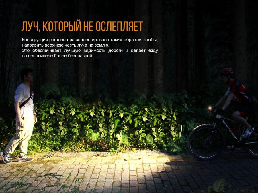 Одной из особенностей данной велофары является наличие специальной оптической системы, которая преломляет часть исходящего луча света и направляет его на освещение пространства прямо перед пользователем. Таким образом, велофара Fenix BC35R обеспечивает освещение на ближнюю и дальнюю дистанцию. Светодиод отличается достаточно высокой мощность и при длительной эксплуатации может сильно нагреваться. Именно поэтому производитель снабдил данную модель современным термоконтроллером. Он в автоматическом режиме понижает максимальный доступный уровень яркости при нагреве фонаря свыше 65°C (после падения температуры все заблокированные режимы станут вновь доступными).