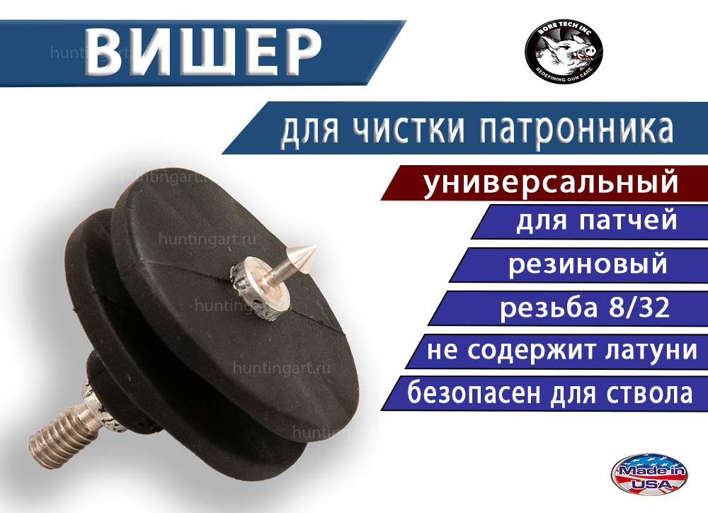 Вишер безопасен для ствола - устойчивый к химическим повреждениям - не содержит латуни - сверхпрочные. Использовать эти вишеры рекомендуется с шомполами BORE STIX (с вращающейся рукоятью) во избежание повреждения дульного среза при движении шомпола в обратном направлении.
