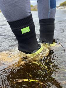 Аналогичная ситуация возникает у всех тех, кто пользуется вейдерсами. Находясь в холодной воде ноги, хоть и находятся в неопреновом чулке, достаточно быстро начинают мёрзнуть от конденсата образующегося из-за большой разницы температур. В такой ситуации наши носки, это единственный выход из положения. Вся влага останется на внешнем слое носка. Мембрана не пропустит конденсат, нога дышит, а тёплая подкладка с большим содержанием натуральной шерсти мериноса её согреют.