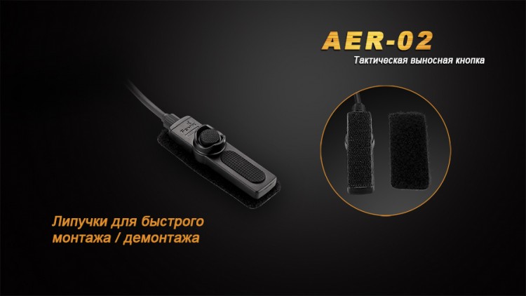 Компания Fenix выпустила более совершенный вариант отлично себя зарекомендовавших тактических кнопок. Модель получила название Fenix AER-02. Такая кнопка состоит из корпуса-адаптера, который заменяет собою обычный хвостовик фонаря. Она сделана из металла и покрыта слоем анодирования Premium Type III. Переходник плотно накручивается на корпус фонаря и исключает любое попадание внутрь влаги или грязи. Непосредственно включить фонарь можно, воспользовавшись контактной площадкой. В отличие от предыдущей модификации, кнопка Fenix AER-02 также позволяет выбрать нужный режим работы фонаря за счет второго переключателя. Оба они работают полностью беззвучно и сохранят работоспособность по крайней мере на 100 000 кликов. Перечисленные детали тактической кнопки соединены шнуром, скрученным кольцами как у стационарных телефонов. Благодаря тому, что такой провод легко растягивается, контактную площадку можно вынести на 80 см от фонаря. Она крепится при помощи липучек — еще одного нововведения производителей, которое упрощает быструю фиксацию аксессуара.