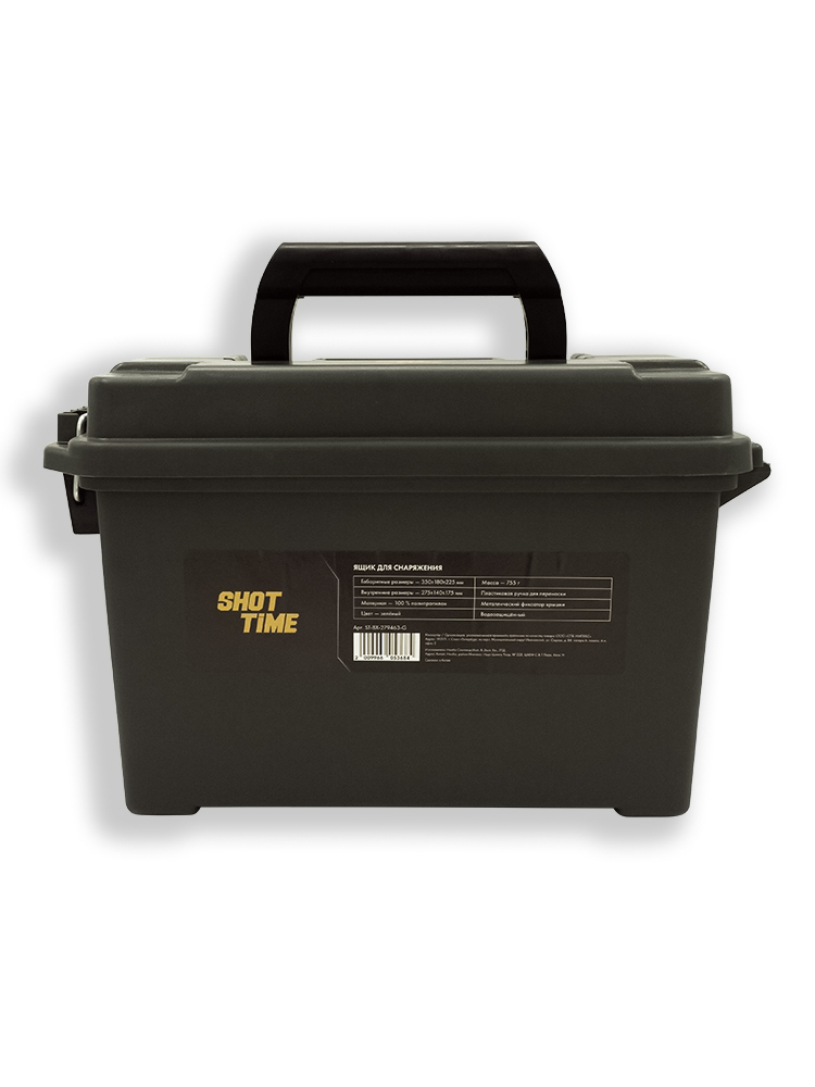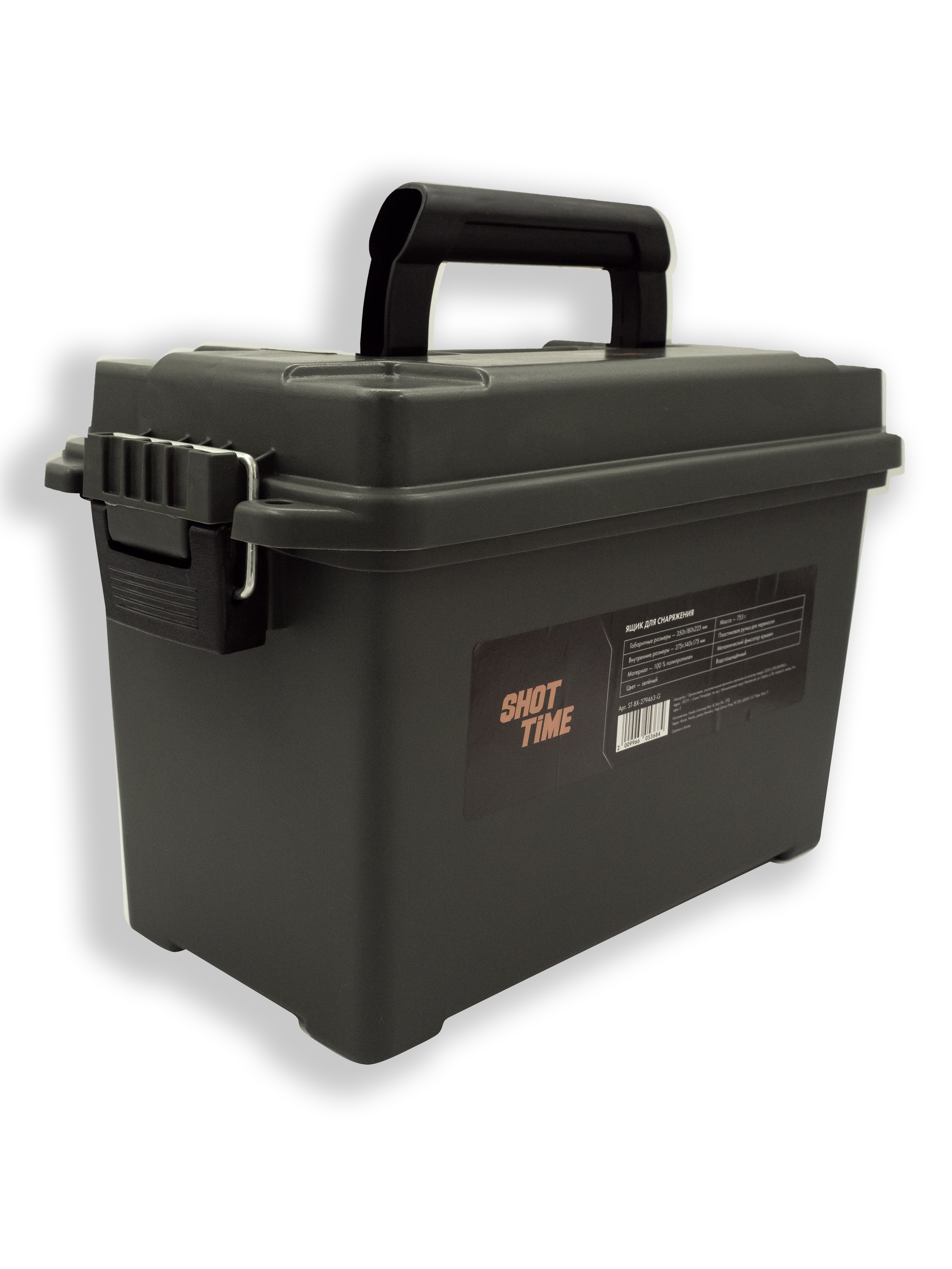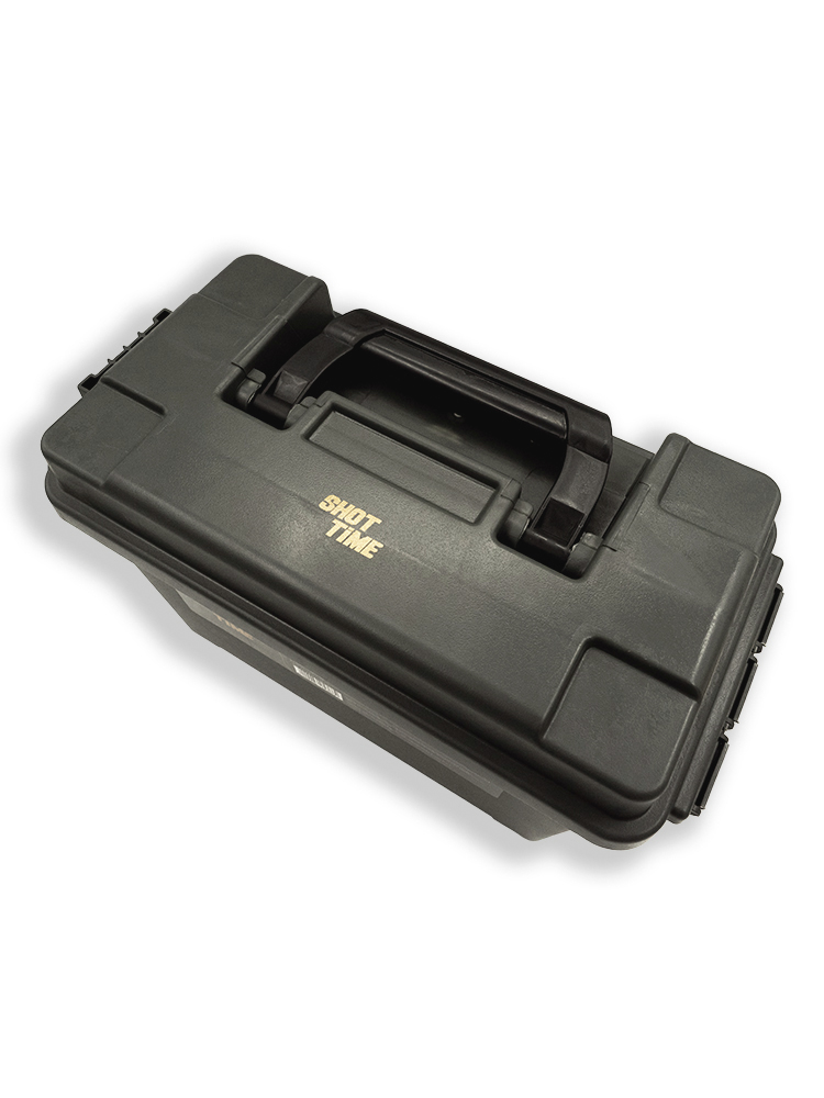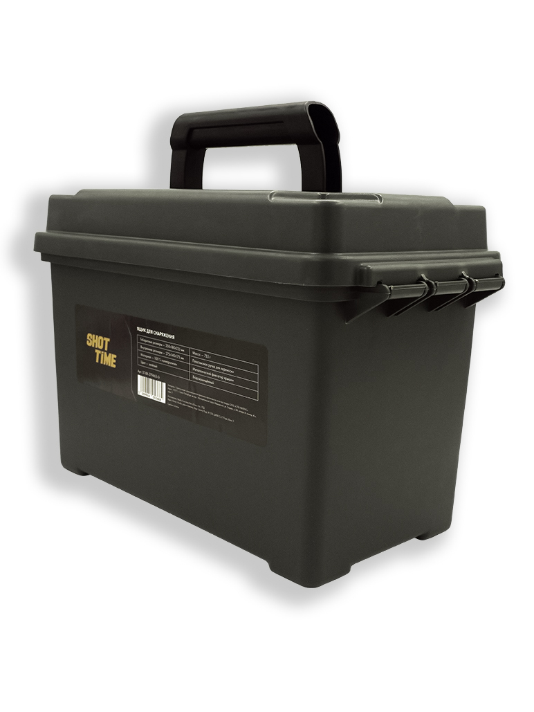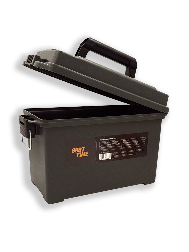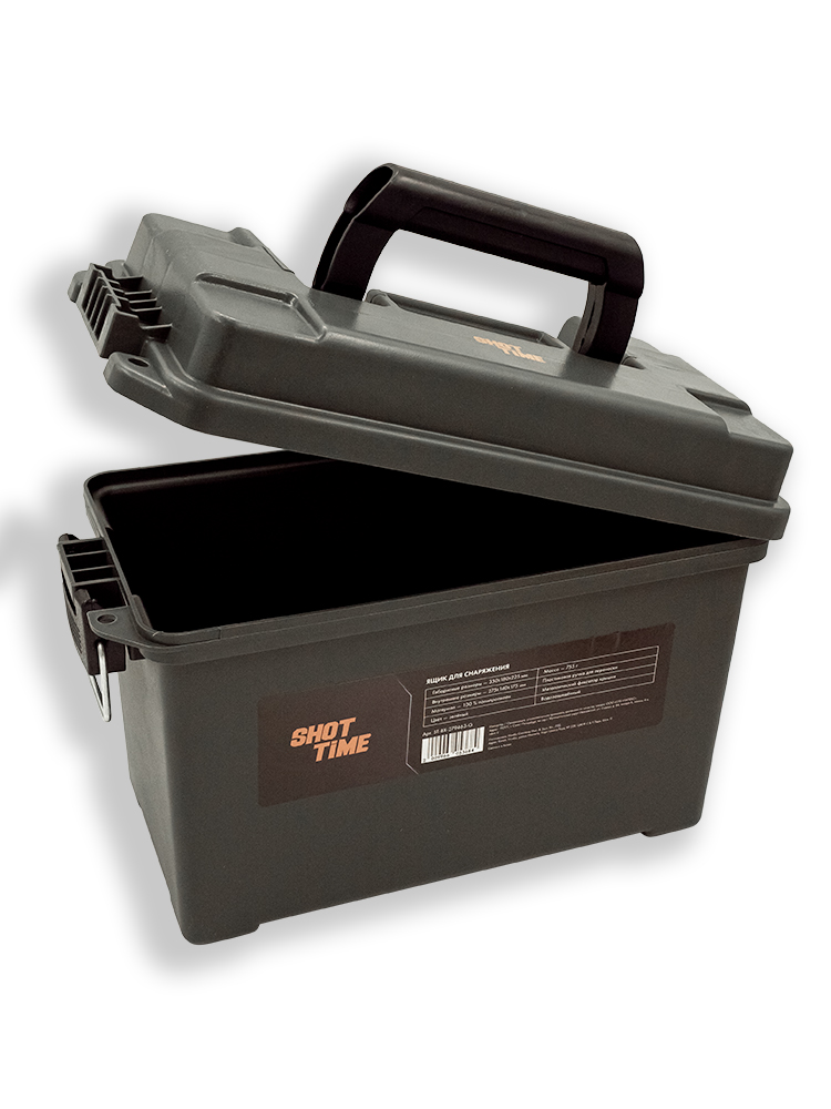 Большой ящик ShotTime — надёжное решение для транспортировки и хранения гладкоствольных и нарезных патронов, как россыпью, так и в заводской упаковке. Вместительный бокс способен разместить 7 стандартных пачек гладкоствольных патронов (175 штук), а также различные мелкие аксессуары и электронику.
