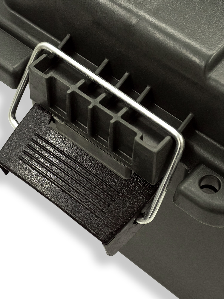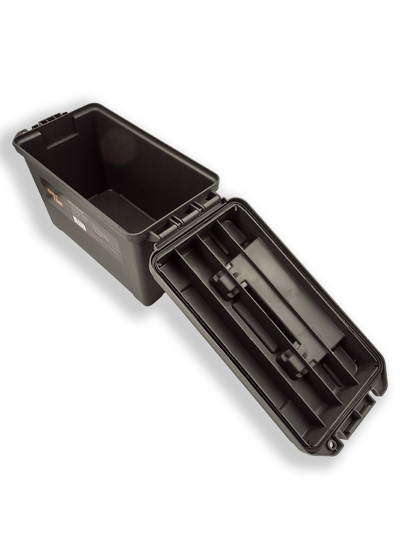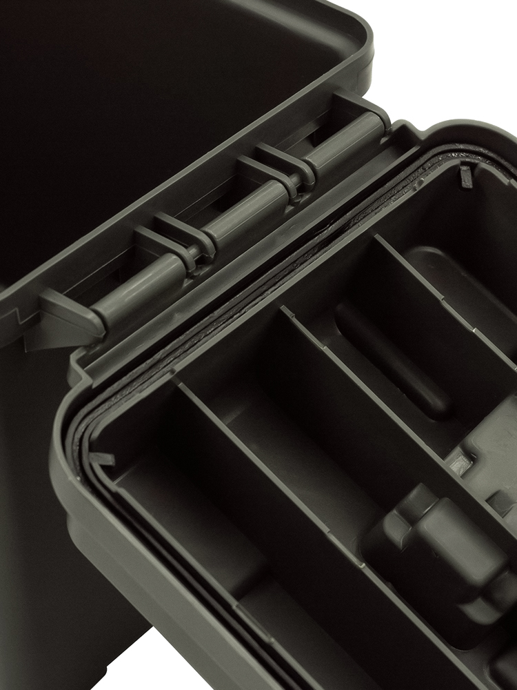 Прочная конструкция из высококачественного ударопрочного полипропилена зелёного цвета обеспечивает максимальную защиту содержимого от ударов, падений, влаги и пыли. Герметичность бокса достигается благодаря резиновой прокладке по периметру крышки, что существенно продлевает срок хранения боеприпасов. Плотное закрытие обеспечивается надёжным боковым замком с металлическим фиксатором.