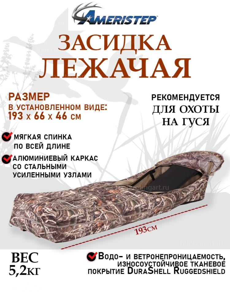 Предназначена для охоты на гуся. Оснащена мягкой подкладкой по всей длине и удобным подголовником, для комфортного нахождения, на земле скрывая охотника, серьезно относящегося к маскировке. Комфортна для длительной охоты. Верх засидки имеет специальное износоустойчивое тканевое покрытие DuraShell™ Ruggedshield, не продувается ветром и не промокает. На уровне лица, оснащена откидывающейся камуфлированной сеткой. Открывающаяся створка засидки позволяет быстро изменить положение тела для стрельбы. Имеет сверхпрочный алюминиевый каркас со стальными усиленными узлами. Засидка для охоты легко маскируется сопутствующей охоте растительностью.